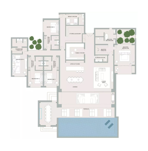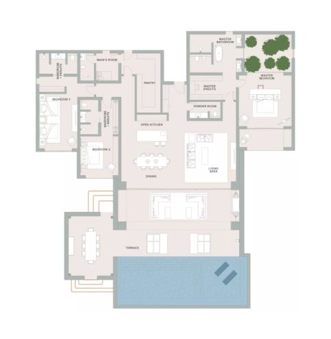 A limited collection of just 35 exclusive villas are available for sale in The Ritz-Carlton Residences Ras Al Khaimah, Al Wadi Desert, with property sizes ranging from 4,945 sq. ft to 7,014 sq. ft. The number of bedrooms in each villa varies from 3 to 5, and the stunning branded residences come fully furnished, making them a perfect option for a vacation home. These desert safari inspired villas include generous terraces, from where you can enjoy breathtaking views of the desert dunes, and are complemented by private swimming pools with stunning relaxation areas.